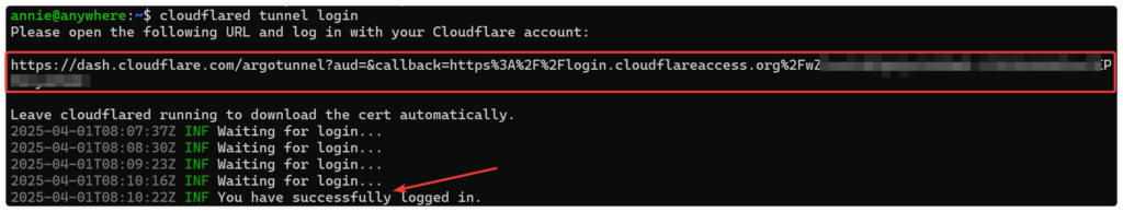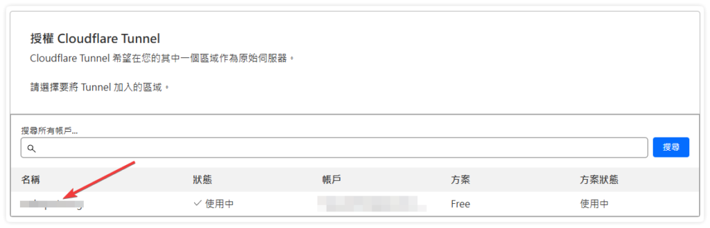 複製網址列,並將它貼上瀏覽器登入你 cloudflare 帳號選擇你要加入這個 tunnel 的網域,成功後會自動在使用者的家目錄建立 .cloudflared 的資料夾